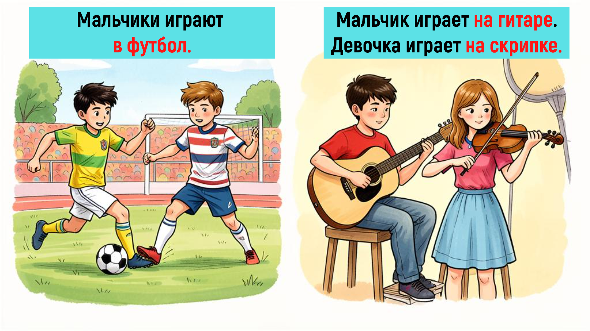 - Примеры: играть на гитаре, играть на пианино, играть на флейте.